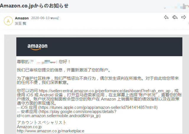 不过好在,从6月13日晚上开始,便陆续有卖家收到了亚马逊误判的道歉邮件。表示已重新激活账号,并对误判一事深表歉意。