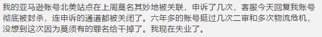 每次大规模封号,总会误伤一批无辜卖家,这次也不例外。不少卖家都表示自己的账号无辜被关联,申诉无果,甚至被彻底封杀,风风雨雨走过6年,却被莫须有的罪名干掉,面临着失业危机。