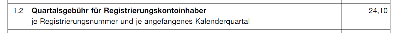 注册账号管理费用是在2023年新增的费用。每个季度的费用是24.1欧元(不含税),一年有4个季度,因此一年的费用总计为96.4欧元(不含税)。