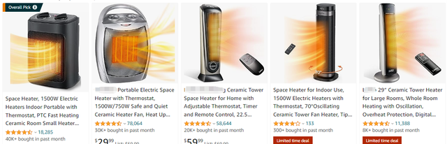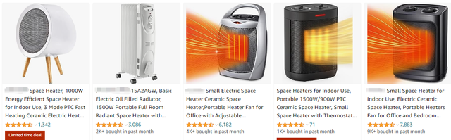 加热器称得上是冬季取暖产品的销量王者,每年都有多款产品登上Best Seller榜单。在亚马逊上输入关键词搜索,发现已有不少产品bought in past month过千破万,销量惊人。