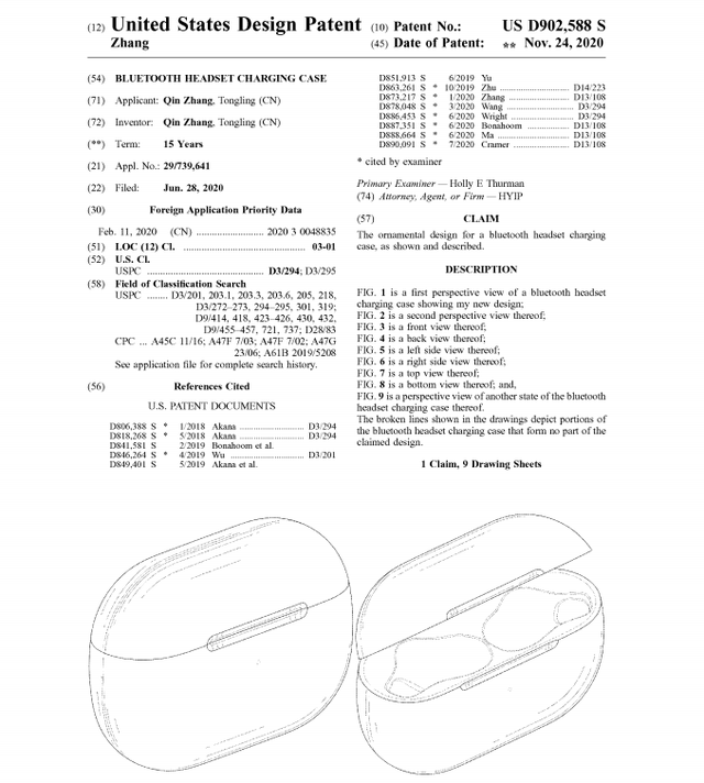 涉及名为Bluetooth headset charging case的美国外观专利,专利号USD902588S,2020年6月28日申请,2020年11月24日下证: