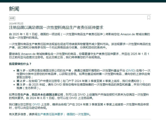 欧洲市场的合规法案真的是一茬接一茬!近日,亚马逊发布最新通知:自2025年1月1日起,德国站卖家需满足一次性塑料商品生产者责任延伸要求,若未在此之前提交注册号,亚马逊将停售不合规产品。